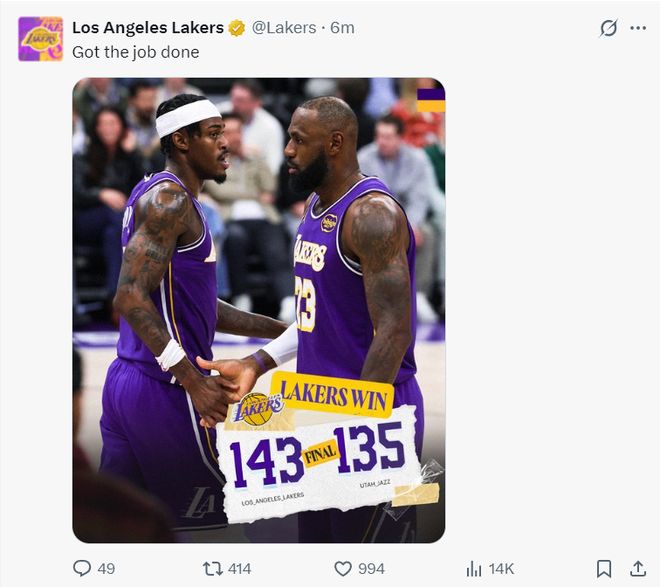 湖人143-135爵士 球员评价:4人满分,4人良好,3人低迷